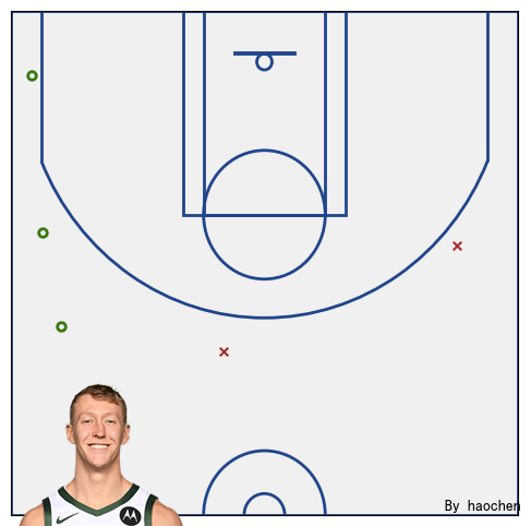 在过去10场比赛,AJ-格林场均贡献7.1分,以及2.0个三分,其中在相对比较容易的三个三分投射区域AJ-格林分别的投篮命中率为弧顶40.70%,左侧底角0.00%,右侧底角87.50%。也就是说在3分球上本场比赛与过去10场相对比出手占比突增,差值为18.87%。