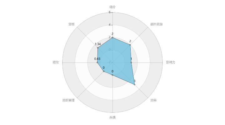 本场比赛AJ-格林获得了1次助攻,占球队助攻比例的3.7%。而对于AJ-格林而言如何在个人进攻和助攻之间达成一种默契也是非常重要的,其本场比赛的得分为9,在过去5场比赛他的助攻占球队的比例保持在10.30%,场均失误次数为0.6。