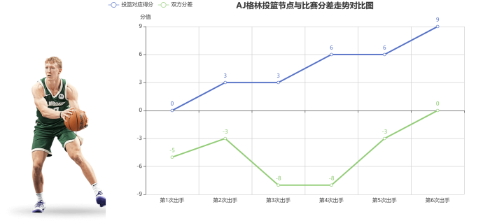 与过去5场比赛相对比AJ-格林在得分上几乎没有变化,差值为1.2;整体投篮命中率下跌,差值为4.8;得分方式上显著增长,三分球出手占比分别为100.0%、80.65%。